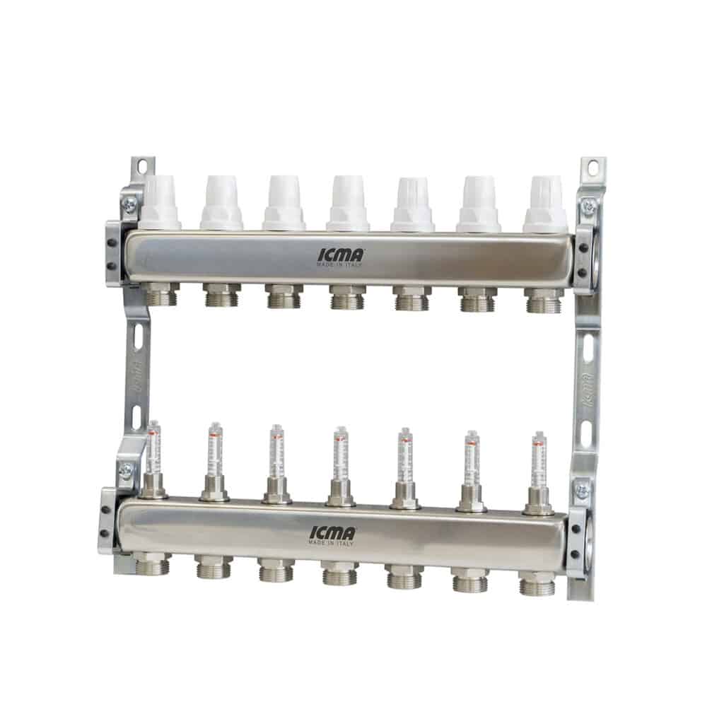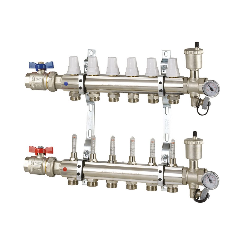 Kit di collettori in acciaio inox con regolazione ed intercettazione manuale/termostatizzabile con misuratori di portata. Staffe di fissaggio (art. 208L) con guarnizioni antivibrazione. I regolatori di portata permettono di chiudere e regolare il passaggio. Filettatura per i raccordi 3/4 Euroconus. Scegliere comandi elettrotermici con connessione 28x1,5.