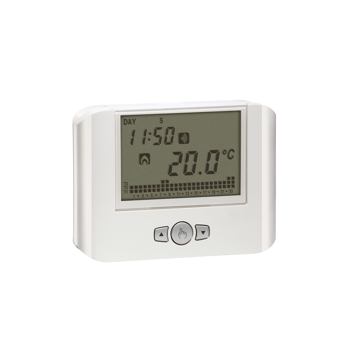 Ежедневный цифровой хронотермостат. Питание от батареек. Диапазон регулировки 2°C- 35°C. 3 уровня температуры для каждого часа. Для отопления и кондиционирования.