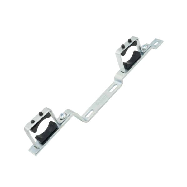 Staffa di fissaggio con guarnizioni antivibrazione interasse fra i due collettori 210 mm. Permettono l’alloggiamento dei collettori nelle cassette con profondità 110 mm. (ns. art. 197). La parte inferiore è realizzata in modo tale da agevolare passaggio delle tubature risolvendo il problema della curvatura di allaccio delle tubazioni.