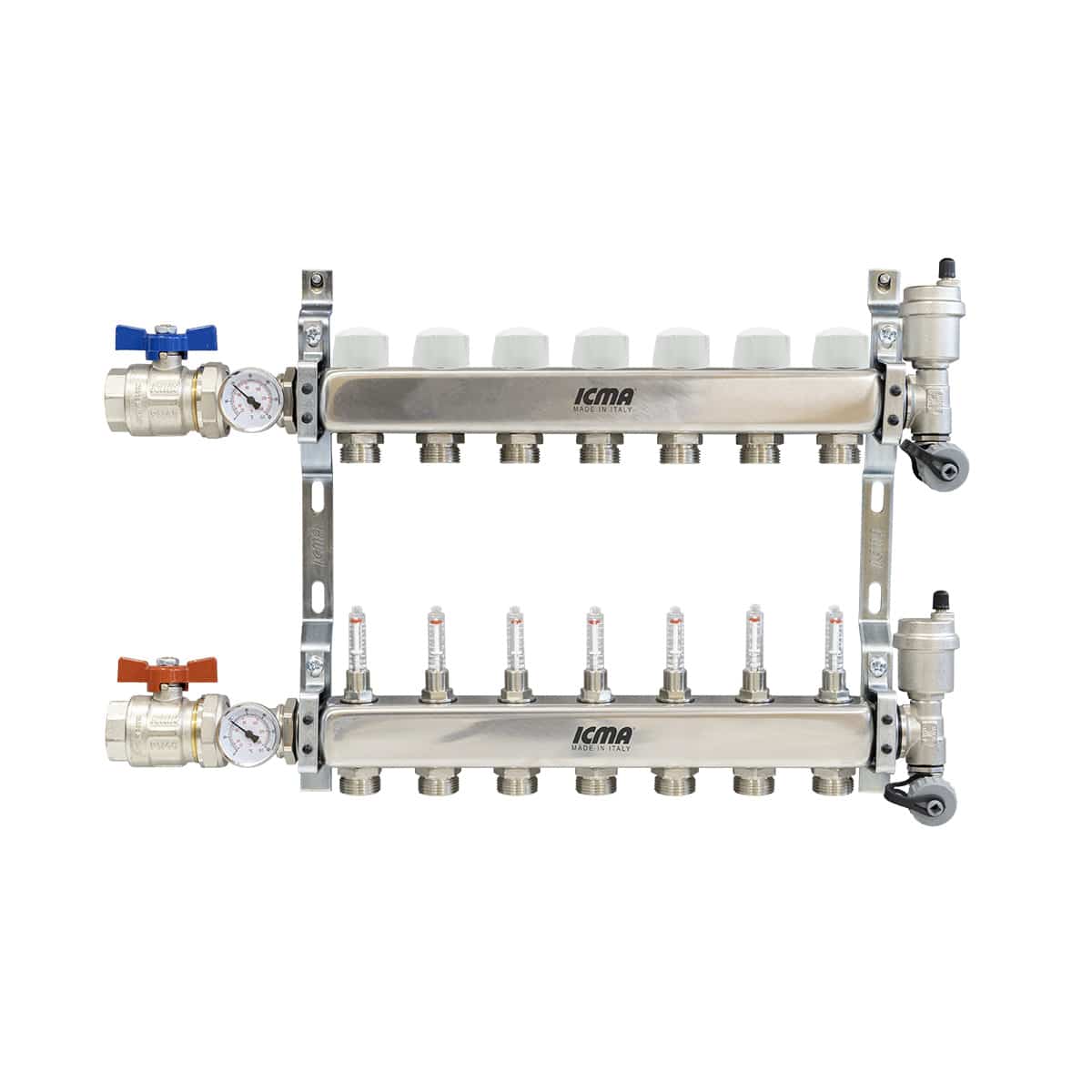Manifolds unit with memory flowmeters and valves with thermostatic option. It Includes: 2 ball valves (art. 215), connection to the ball valve with gasket with flat seat and o-ring, 2 brackets (art.208) with anti-vibration supports, 2 built-in manual air vents with o-ring (art.705), 2 1/2” drain cocks (art.172), 2 1” thermometer caps with o-ring (art.185), 2 0-60° thermometers (art.206).