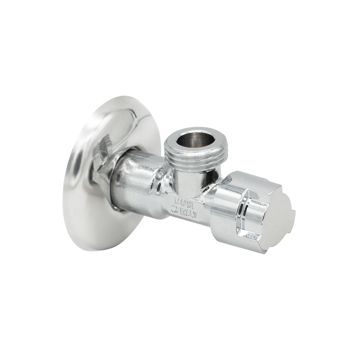 Rubinetto sotto lavabo, movimento a vitone, 1/2” con attacco da 3/8”, 1/2” o 3/4” a sede piana per tubo flessibile con rosone in acciaio cromato.